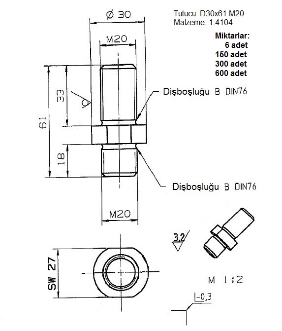 Malzeme : paslanmaz AISI 430F, ( X12CrMoS17 )