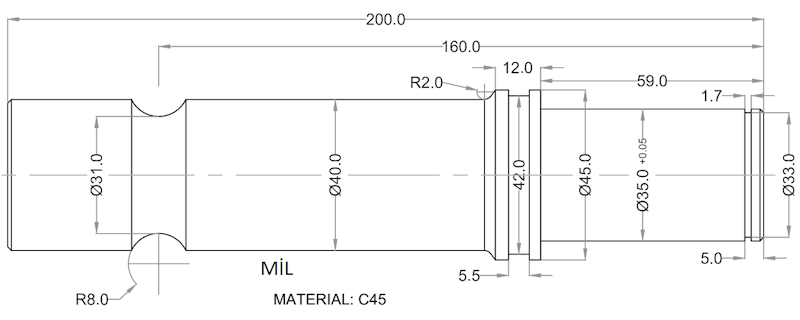 C45 malzemesinden 200 mm uzunluğunda en geniş çapı 45 mm mil