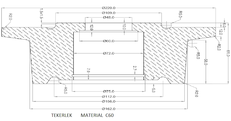 C60 malzemesinden dış çapı 220 mm ve genişliği 81 mm tekerlek