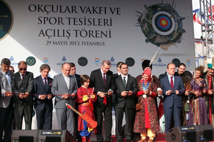 Erdoğan, "Buradan Fatih'in orduları sefere çıkardı ve burada okçuluk, ok atışları yapılırdı. İşte şimdi tarih ayağa kalkıyor" dedi. Başbakan Şöyle devam etti: “Tesisin açılışında Fetih Kupası müsabakalarına katılan ve mücadele veren sporcuları, Dünya Okçuluk Federasyonu'nu ve Türkiye Okçuluk Federasyonu'nu kutluyorum. Okmeydanı, bundan 560 yıl önce İstanbul'un fethine şahitlik etmiş, Fatih Sultan Mehmet'in ordusuna kışla olmuş, ardından da yıllar boyunca, başta okçuluk olmak üzere birçok vazifenin ifa edildiği bir mekandı. Son yüzyıl içinde maalesef Okmeydanı'na, buradaki tarihi yapılara gereken ehemmiyet gösterilmedi. Bu bölge maalesef, plansız yapılaşmayla işgal edildi, tarihi eserler tek tek yok edildi. 2005'te Okmeydanı'nı yeniden ele aldık, çarpık yapılaşmadan temizledik ve burayı korunması gereken kültür varlığı olarak ilan ettik. 2010'da hazırladığımız bir projeyle, bu bölgeyi yeniden ihya etme çalışmalarına başladık. KİPTAŞ ile Gür Yapı firması, 2011'de inşaat çalışmalarını başlattı, çok kısa süre içinde de inşaat tamamlandı, Okmeydanı yeniden hayat buldu. Okçular Tekkesi ve Spor Tesisleri, olimpik ebattaki ok atma sahası ile toplam 18 bin metrekare bir alana kavuştu. Burada hem tarihi eserleri aslına uygun olarak yeniden inşa ettik hem de ülkemize, dünyaya, olimpik standartlarda bir spor tesisi kazandırdık. Okmeydanı'nı, tarihi tekkesiyle, mescidiyle, Hünkar Kasrı'yla yeniden buluşturduk. En önemlisi de Okmeydanı'nı okuyla yeniden kucaklaştırdık. İnşallah, tarihte olduğu gibi, bugün ve gelecekte de Okmeydanı, ismine yaraşır şekilde okçuluğun, okçuluk sporunun dünyadaki merkezi konumuna yükselecek."