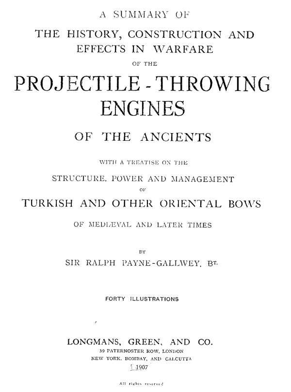 A SUMMARY OF THE HISTORY, CONSTRUCTION AND EFFECTS IN WARFARE OF THE PROJECTILE THROWING ENGINES OF THE ANCIENTS WITH A TREATISE ON THE STRUCTURE, POWER AND MANAGEMENT OF TURKISH AND OTHER ORIENTAL BOWS OF MEDIEVAL AND LATER TIMES