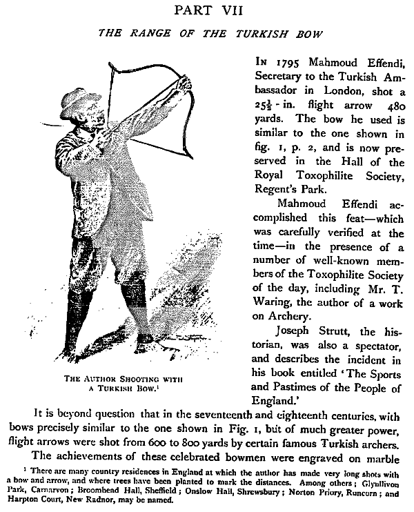 In further connection with long-distance shooting with the Turkish bow, I append a letter written by one of my ancestors to another. They were both skilled and enthusiastic archers in their day. This letter, and the notes and translations which follow it, describe the extraordinary feats said to have been achieved by the Turks with their bows when shooting to attain a long range with a flight arrow: