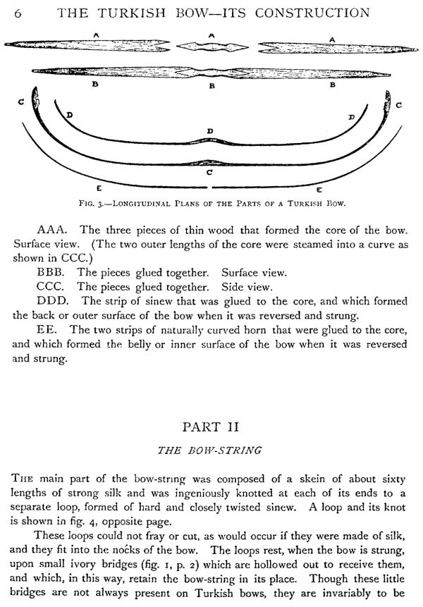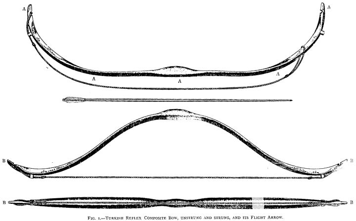 'I asked Waring to what he attributed the Turk's great superiority over our English bowmen whether to his bow or not. Waring replied he did not consider it was so much the result of the Turk's bow, but rather of his strength and skill, combined with the short light arrows he used, and his method of shooting them along the grooved horn attached to his hand.