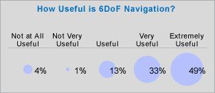 Bu kullanıcıların %83'ü 3D Mouse'ların 6DoF navigasyon özelliğini "çok kullanışlı" ya da "mükemmel derecede kullanışlı" buldu, ve nerdeyse yarısı (%49) ise "mükemmel derecede kullanışlı" buldu. Neredeyse tüm kullanıcılar bu özelliği "kullanışlı" ya da "daha iyi" buldu.