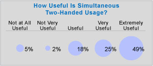Aynı anda iki elle çalışmayla ilgili olarak, %75 3D Mouse'ların 2 elle çalıştırabilme özelliğini "çok kullanışlı" ya da "mükemmel derecede kullanışlı" buldu, ve yine neredeyse yarısı,