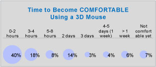 Kullanıcıların yarıdan fazlası (%58) ilk dört saatte, büyük çoğunluğu ise (%80) iki gün içinde 3D mouse ile kendilerini rahat hissetmeye başladılar.