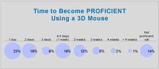 Peki kullanıcıların 3D mouse ile rahat değil de, "uzman" hissetmeleri ne kadar alır? Araştırma sonuçlarına göre, 3D mouse kullanıcıları hızlı bir şekilde "rahat hissetmek"ten "uzman hissetme" kısmına geçiş yaptılar: Kullanıcıların %66'sı ilk hafta içinde, %78'i ise 2 hafta içinde uzmanlaştılar.