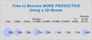 Bir 3D mouse kullanıcısı ne kadar zamanda daha üretken hale gelir? Bu değiştirilen her çalışma yönteminin nihai amacıdır. Kullanıcıların neredeyse yarısı (%45), iki gün içinde; %68'i ise 1 hafta içinde daha üretken hale geldiklerini rapor ettiler.