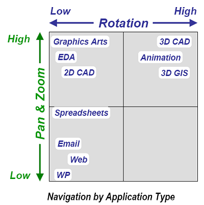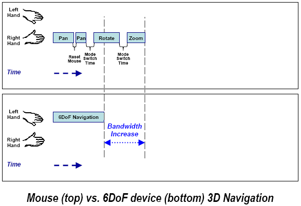 3D CAD kullanıcıları sıradan bilgisayar kullanıcılarına oranla 5 ila 10 kata kadar daha fazla navigasyon/dakika ve komut/dakika oranına sahip. 6DoF navigasyonlar yaygın. Bu noktalar, 3D CAD kullanıcılarının uygulamalarını kullanırken, onlara üretkenlik artışı ve kullanıcı arayüzü bant genişliğini artırma önemli fırsatlar sundu.