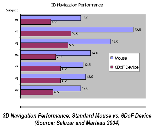 GE çalışmasında, kullanıcılar 2D klasik fareye oranla 6DoF ürün (3Dconnexion 3D fare) ile 3D modelin hedef noktasına nerdeyse 2 kat daha hızlı ulaşabildiler.