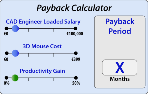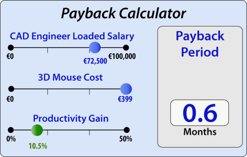 Şu iki değişken çok basit: 3D fare fiyatı ve CAD tasarımcısının yıllık toplam maaşı. Kritik değişken -üretkenlik artışı- ise 3D fare kullanıcıları araştırmasından elde edilmiştir.