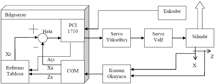 Bu çalışmada kartın 8 bitlik sayısal giriş kanalları enkoderden bilgi okumak için ve 1 analog çıkış da kontrol sinyali için kullanılmıştır. Kartta bulunan analog çıkışlar ± gerilim vermek yerine 0 ve + yönde (maksimum 10 V) gerilim üretmektedir. Servovalfin ise ± yönlü akımla tahrik edilmesi gerektiğinden, bu olumsuzluğu çözmek amacı ile kontrol sinyalinin çıkışı 2,5 V'luk gerilime sahip bir güç kaynağından geçirilmiş ve böylece 0-5 V analog çıkış voltajına bir gerilim kaydırma uygulanmıştır. Bununla, kontrol sinyalinin ±2,5 V aralığında tutulması sağlanmıştır. Sistemdeki torna arabasının ve kesici takımın konumunu ölçen lineer cetvellerden alınan sinyaller bilgisayarın COM portu kullanılarak okunmaktadır.