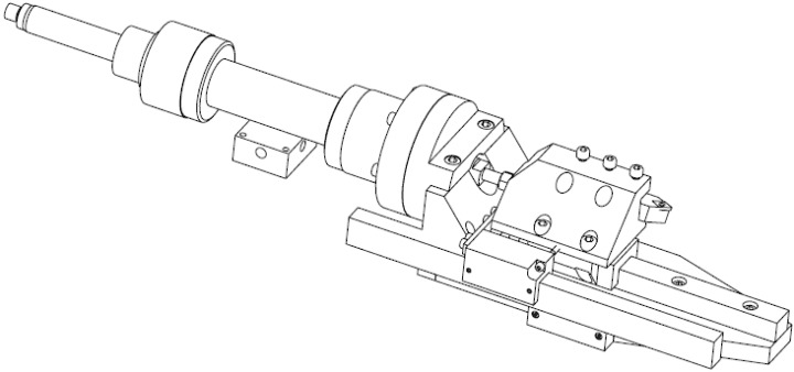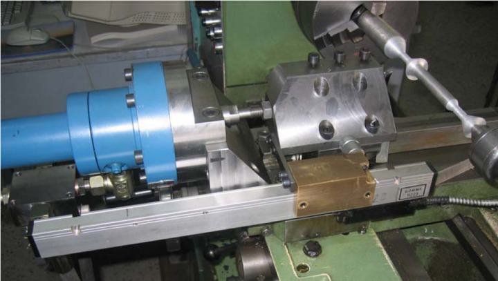 Profil tornalama sistemi, özellikle oval tornalama esnasında çok küçük kurslarda çalışacağından, kesme takımı konumunun tekrarlanabilme özelliği önem kazanmaktadır. Yani, sistem kızak ve ilerletme mekanizması boşluklarına son derece duyarlıdır. Bu ihtiyacı karşılamak için torna arabasının siperi sökülerek valf-silindir, lineer cetvel ve kesici takımın bir arada bulunduğu bir mekanizmanın tasarımı ve imalatı yapılmıştır (Şekil 3). Kesici takımın hareketi için, INA marka KUVE serisi 30'luk anma ölçüsüne sahip 4 sıra rulmanlı lineer kızak kullanılmıştır. Bu yataklar ön yükleme ile (yani sıfır boşluklu) montaj edildiklerinden ve sertlikleri de 63 HRC civarında olduğundan konum doğruluğu rahatlıkla sağlanabilmiştir. Hareket düzeneğinin tezgaha montaj edilmiş haldeki görüntüleri Şekil 4'de verilmiştir.