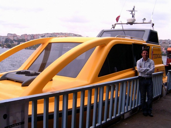 İlk kez Mart ayında denize indirdiğimiz prototip ile test çalışmaları devam ediyor. Bu prototipi İstanbul Tasarım Haftası kapsamındaki fuar alanında sergiliyoruz. Bu prototipin üretilmesi yaklaşık altı aylık bir süre aldı. Öncesinde 1.5 yıllık bir mühendislik çalışması söz konusu. Mühendislik çalışmalarda doğal olarak CAD/CAM teknolojileri kullanılarak yapıldı. Bilgisayar ortamında aracın deniz üzerinde çeşitli deniz koşullarındaki davranışları simüle edildi ve özellikle alt gövdenin tasarımı tamamen bilgisayar verilerinden yola çıkarak yapıldı. Biz çeşitli gövde tiplerinde denemeler yaptık. Sonunda su üzeri hareketliliğe en iyi cevap veren katamaran gövdede karar kıldık. Bilgisayar ortamında yaptığımız ergonomik analizlerle yolcu yerleşimleri kullanım alanlarını tasarlayarak bu gün prototipte gördüğünüz tasarım ortaya çıktı.
