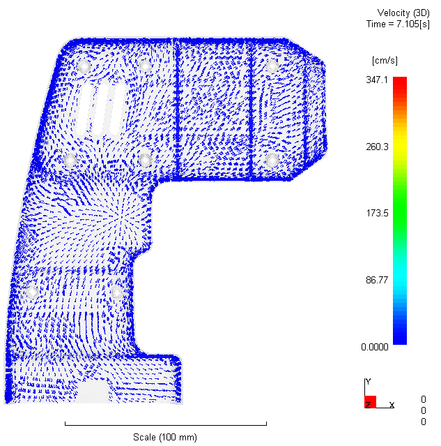Akış şekli, yönelimi ve hızı uygundur. Üretim şartlarına bağlı olarak işlem zamanı kısaltılmak istenebilir. 30 saniyeyi bulan toplam işlem zamanı sıcak yolluk veya bu durumda uygulanan direk nokta giriş kullanımını gerekli kılmaktadır [4].