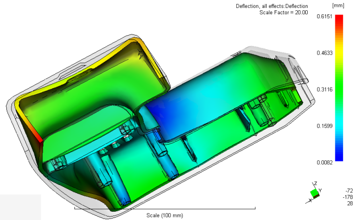 Çarpılmayı azaltmak hem konstrüktif hem de enjeksiyon parametrelerde değişiklik ile mümkündür. Resim 17 ve Resim 18'de çarpılmanın, görsel amaçlı yirmi katına çıkarıldığı hal görülmektedir.