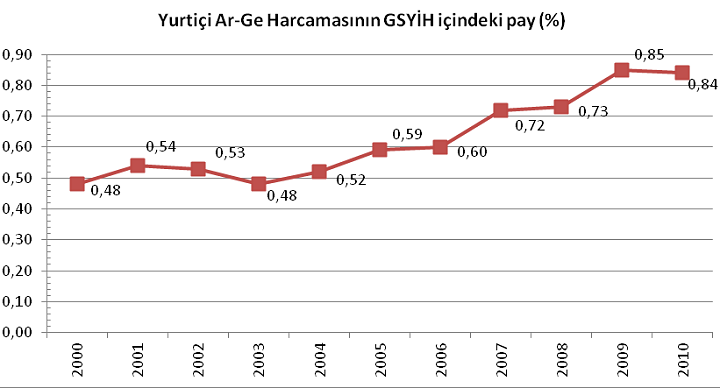 2010 yılı Ar-Ge Faaliyetleri Araştırması sonuçlarına göre kamu kuruluşları, vakıf üniversiteleri ve ticari sektördeki anket sonuçları ile devlet üniversitelerinin bütçe ve personel dökümlerine dayalı olarak Türkiye’de Gayri Safi Yurtiçi Ar-Ge Harcaması 2010 yılında bir önceki yıla göre % 14,6 artarak 9 268 Milyon TL olarak hesaplanmıştır. Türkiye’de Gayri Safi Yurtiçi Ar-Ge harcamasının Gayri Safi Yurtiçi Hasıla (GSYİH) içindeki payı ‰8,4’tür [2].