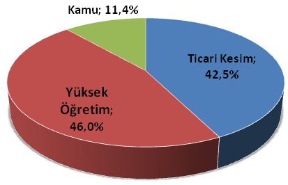 Ar-Ge harcamaları, finanse eden kesimler itibarıyla incelendiğinde; 2010 yılında harcamaların %45,1’i ticari kesim, %30,8’i kamu kesimi, %19,6’sı yükseköğretim kesimi, %3,7’si yurtiçi diğer kaynaklar ve %0,8’i yurtdışı kaynaklar tarafından karşılanmıştır [2].