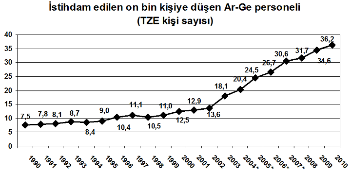 2010 yılında Tam Zaman Eşdeğeri (TZE) cinsinden toplam 81 792 kişi Ar-Ge personeli olarak çalışmıştır. Bir önceki yıla göre TZE cinsinden Ar-Ge personel sayısındaki artış %11,3’tür. Sektörler itibarı ile dağılıma bakıldığında, TZE cinsinden toplam Ar-Ge personelinin 2010 yılında %45,9’u ticari kesimde, %40,2’si yükseköğretim kesiminde ve %13,9’u kamu kesiminde bulunmaktadır. 2010 yılında istihdam edilen 10 000 kişiye düşen Tam Zaman Eşdeğeri (TZE) Ar-Ge personeli sayısı 36,2 kişidir [2].