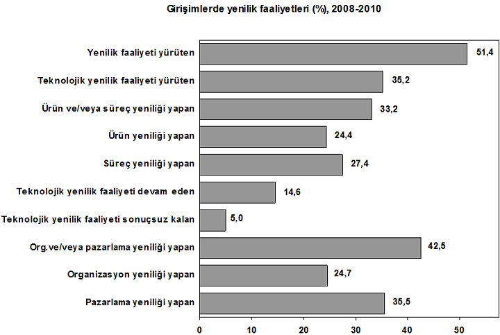 Türkiye İstatistik Kurumu’nun (TÜİK) 25 Kasım 2011 tarihinde yayınladığı “2008 - 2010 Yenilikçilik Araştırması” [4] Türkiye’de yürütülen inovasyon faaliyetlerinin son durumu ile ilgili önemli bilgiler vermektedir. 2008-2010 yıllarını kapsayan üç yıllık dönemde 10 ve daha fazla çalışanı olan girişimlerin %51,4’ü yenilik faaliyetinde bulunmuştur [4].