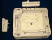 Sağda, bu kalıp kullanılarak üretilmiş plastik parçalar