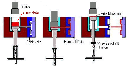 alttaki piston ergimiş metal kamaraya dolarken, kalıp giriş