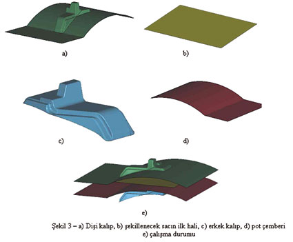 çarpar ve erkek kalıp (Şekil 3c) sacı gererek dişi kalıbın