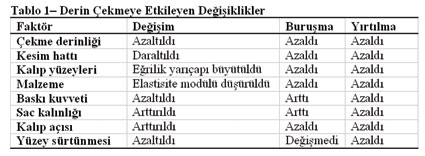 araştırmalar sonucunda derin çekme işlemine etki eden faktörler