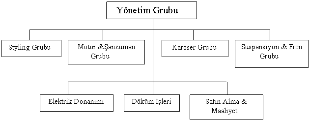 Projede öncelikle bir yönetim grubu teşkil edilmiştir. Yönetim grubunun görevi projenin genel olarak takip &koordinasyonu, gerektiği zaman üst makamlarla iletişim ve ayrıca yeri geldiğinde ilgili bölümlere destek vermektir. (Örnek, 2008). Çalışma grupları sırasıyla; Styling Grubu, Motor Şanzuman Grubu, Karoser Grubu, Suspansiyon &Fren Grubu, Elektrik Donanımı, Döküm İşleri, Satın Alma ve Maliyettir (Sağın, 2004).