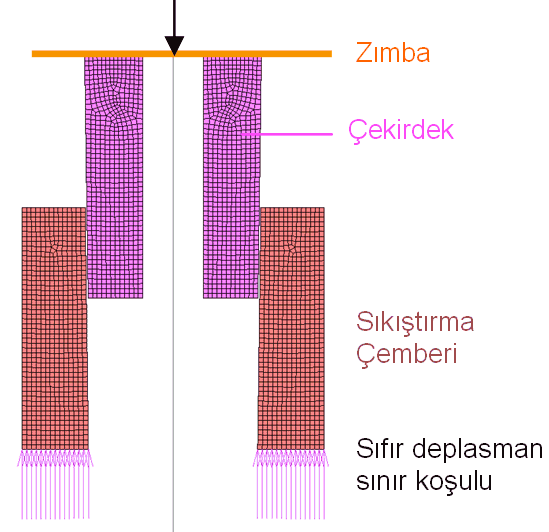 2.2. Presle geçime yöntemi: Bu yöntemle temas yüzeyine açı verilmiş olan kalıp çekirdeği, deplasman sınır koşulu veya düzlemsel bir temas elemanı ile sıkıştırma çemberine itilir (Şekil 3). Bu yöntemin sonlu eleman modellenmesinde, sıkıştırma çemberi tabanına 'sıfır deplasman' sınır koşulu verildiğinde, sıkıştırma çemberinin esnemesi kısıtlanmakta, ve kalıp çekirdeğine gerçekte var olandan daha fazla miktarda basınç etki ediyor olarak gözükmektedir. Bu nedenle, bu yöntem kullanılırken Şekil 3'te görüldüğü gibi, sıkıştırma çemberi tabanına sıfır deplasman vermek hatalı sonuçlar ortaya çıkaracaktır. Bunun yerine, sıkıştırma çemberi düz yüzeyi temsil edecek bir doğru üzerine oturtulmalı ve temas ayarları bu şekilde yapılmalıdır.