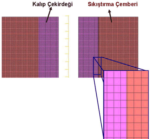 2.3. Üst üste bindirme yöntemi: MSC. Superform programının bir özelliği olarak kalıp çekirdeği ve sıkıştırma çemberi ağ yapısı istenen sıkılık oranında üst üste modellenip temas ayarları kullanarak sıkılık değeri parçalar arası temas parametresi olarak girildiğinde, yazılım tek adımda sıkı geçirme işlemini yapıp [2], iki parça için de tüm deformasyon ve gerilme analizlerini aynı adımda gerçekleştirmektedir (Şekil 4). Ayrıca, MSC. SuperForm yazılımında bulunan 'hold node' sınır koşulu ile, seçilen yüzeydeki düğüm noktalarının, analiz sonrası gerilme dağılımı değişmeden ilk pozisyonlarına geri dönmesi sağlanır. Bu özellik, kalıplara boyutsal doğruluk getirmektedir (Ör: kalıplar iç yüzeyi sıkı geçirme işleminin ardından taşlanarak son ölçüsüne getirilmektedir. Sonlu Eleman Modelinde, kalıp son ölçüsünde çizilerek ağ yapısı örülür, iç delikte sıkı geçirmeden dolayı meydana gelen büzüşme 'hold node' sınır koşulu ile ilk haline döndürülebilir)