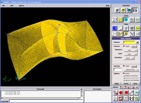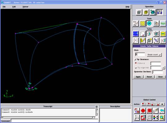 Daha sonra rüzgar tünelindeki fanın ağ tabakası oluşturulur. Bu işlem için de Gambit programı kullanılır (Şekil 4). Eksenel fanları periyodik olduğu için iki kanat arasını modellemek yeterli olacaktır. Sayısal ağ tabakası oluştururken dikkat edilmesi gereken, kanat yüzeyine sınır tabakası kullanılması gerekir. Bu sayede fanın performans değerleri hassas bir şekilde elde edilir.