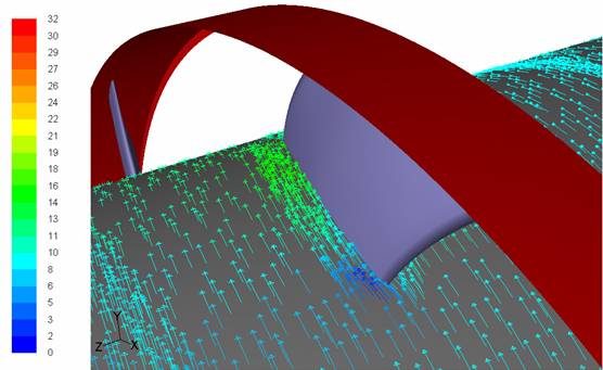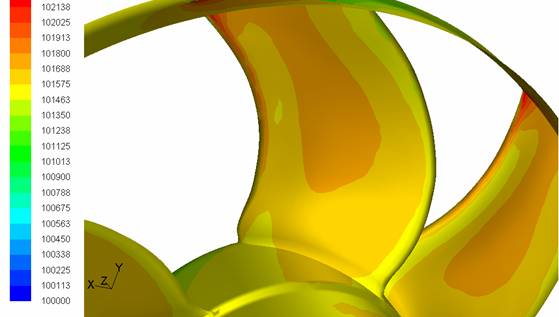 Şekil 5'de, Fluent'de analizi yapılmış bir fan üzerindeki statik basınç dağılımı Şekil 6'da hız dağılımı görülmektedir. Fanın motora bindirdiği yük ise kanat üzerindeki statik basıncın yüzey integralini alarak kanada binen kuvveti, bu kuvvetin, fan merkezine göre momentini alarak hesaplanabilir.