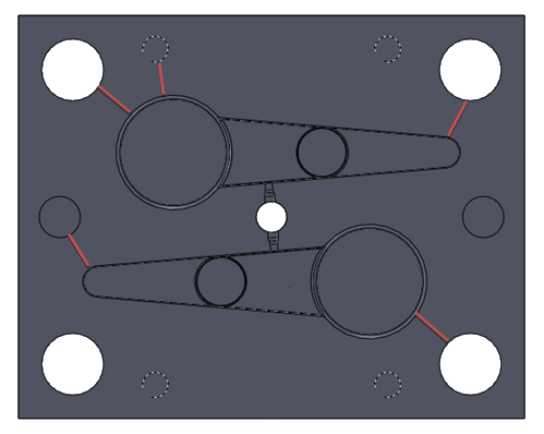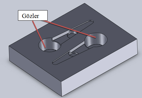 Göz sayısı kalıbın bi seferde kaç ürün çıkaracağını belirtir. Göz sayısının belirlenmesinde parça kullanım adedi, parça geometrisi, kalıp ebatları, kalıp maliyeti, kalıp çalışma şekli gibi faktörler göz önüne alınmalıdır. Gereksiz geniş alana yerleştirme fazla malzeme israfı oalcağından malyetimiz arttıracak, kalıp boyutlarını büyüteceğinden kalıbın gereğinden fazla ağır olmasına neden olacak ve soğumayı olumsuz etkileyecektir.Aksi yönde çok dar alana kalıbı skıştırmakta ileride soğutma sistemi veya itici sisteminni tasarımında yer darlığına neden olacak kalıbın yüzey alanı dar oluğu için enjeksiyon basınçlarına daha az dayanım göstercektir. Bizim parçamız çok miktarda ihtiyaç duyulan bir parça olmadığı için ve parça geometrisi göz önüne alındığında daha dengeli bir dağılım olması için Resim 5’de görüldüğü gibi 2 gözlü olarak yerleştirilmiştir.