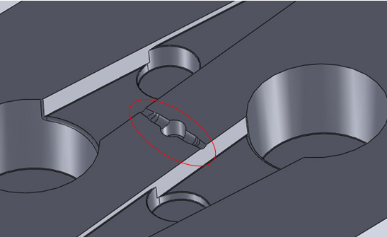 Yolluk ve yolluk girişi ergimiş plastiğin kalıp boşluğuna kadar gitmesini sağlar. Yolluk tasarımına daha önceki bölümde değinmiştik. Bu tasarımda üretim maliyetlerinin düşmesi açısından ve yine ürün adedi fazla olmayacağı için düz yolluk kullanılması daha uygundur. Soğuk yolluk ile merkezden 2 göze dağılım yapılacaktır. Parça Estetiği fazla ön planda olmadığı için giriş parça kenarından kenar giriş belirlenmiştir. Resim 6’da yolluk giriş görünmektedir.