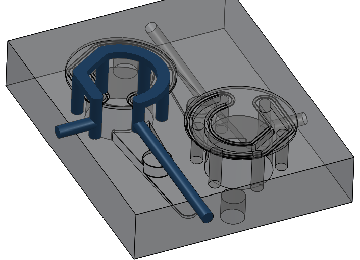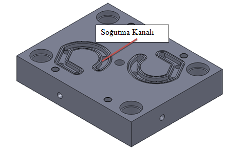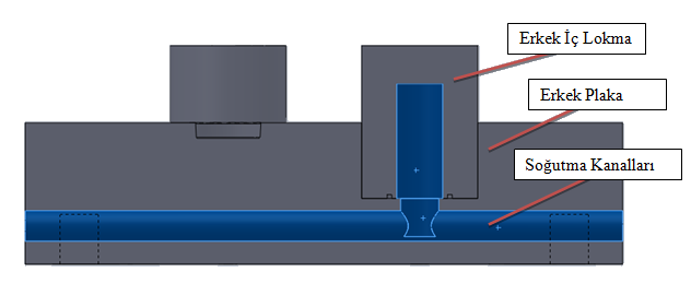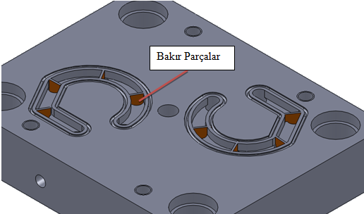 Parçamız düzlemsel olmadığı ve derin dairesel kesitler olduğu için çekirdek soğutma yöntemini kullanmamız gerekmektedir. Resim 11’de dişi plakada derin çekirdek için yapılmış soğutma sistemi görülmektedir.