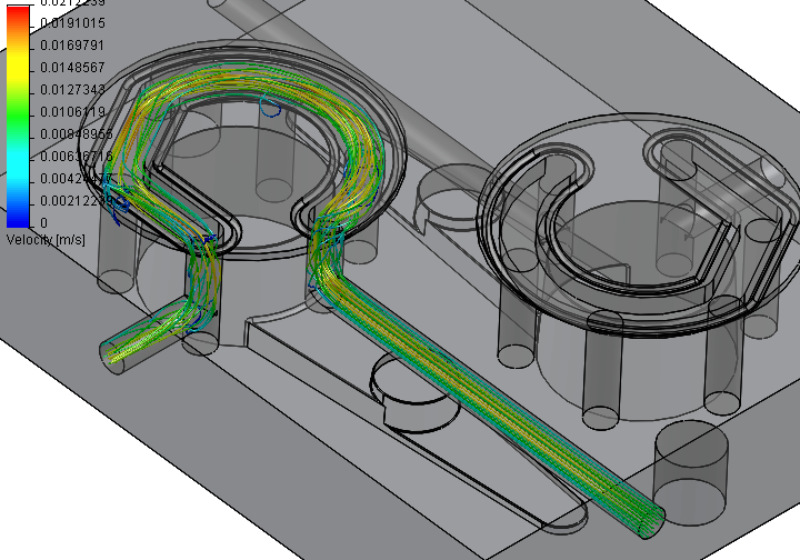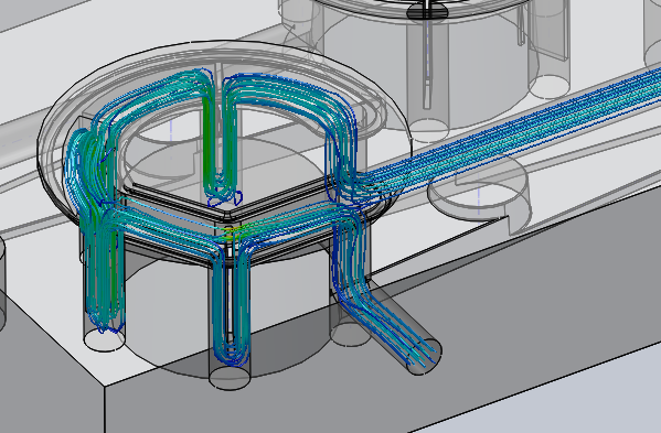 Bu tür derin çekirdek soğutmalarda çekirdek etrafına derinliğine yakın belli bir mesafeye kadar delikler açılır. Deliklerden birine plakanın yanından giriş başka bir değileğede çıkış içini yandan delik delinir. Deliker arasında su geçişini sağlamak için üst kısımdan belli bir miktar frezede işlenmesi gerekmektedir.Fakat Resim 12 deki simülasyonda görüldüğü üzere suyun deliklere girmeden bu açılan kısımdan gittiği görülmektedir