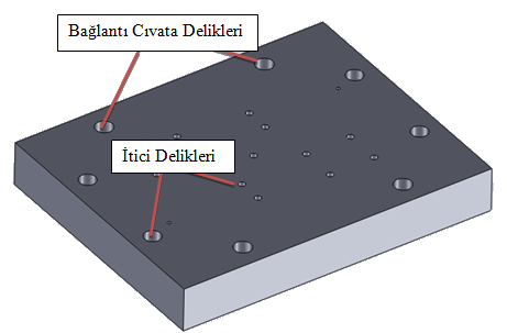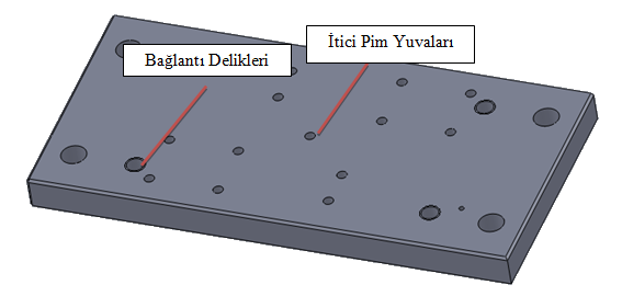 İtme alt plakasında (EK 9) sadece itme üst plakasına bağlamak için bağlantı delikleri vardır. Üst itme plakasında ise itici yuvalarının delikleri bulunur bunlarda ekseninde açılmak zorundadır (EK 10). Aksi halde iticilerin iler geri hareketlerinde sürtünme olur ve zmanlar iticiler aşınarak ürün çapaklı çıkmaya başlar