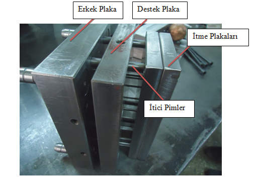Daha sonra itici pimler, destek plaka ve erkek plakadaki itici pim deliklerinden geçecek şekilde itme üst plakasındaki yuvalarına takılır. İtme alt plakasıda üst plakaya cıvatayla bağlanarak itici pimler sabitlenmiş olur.