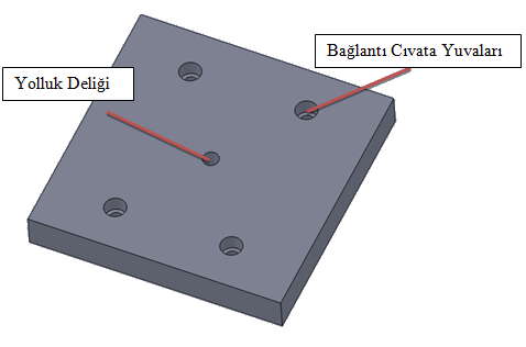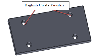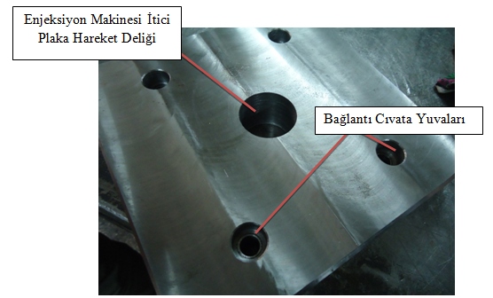 Bağlantı plakalarında (EK 8) bağlantı cıvataları için delikler bulunmaktadır. Ayrıca alt bağlantı plakasında enjeksiyon makinesinin itici plakaya hareket verebilmesi için büyük bir delik bulunur.Üst bağlantı plakasında ise enjeksiyondan gelen ergimiş plastiğin yolluklara ulaşması için delik bulunur