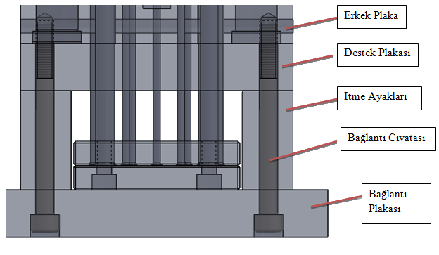 İtme ayakları (EK 11) sadece destek görevi gördüğünden ve itici mesafesi ayarladığından üzerinde sadece bağlantı deliği bulunur. Bağlantı plakası ve destek plakası arasında bulunur. Bağlantı plakası ile erkek plakası arasında cıvata bağlantısı yapılır. Fakat cıvata itmek ayakları ve destek plakasından geçer. İtme ayaklarının bağlantı şekli Resim 36 de görünmektedir.