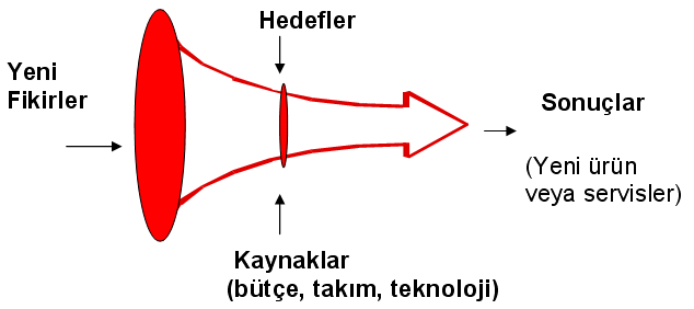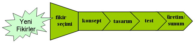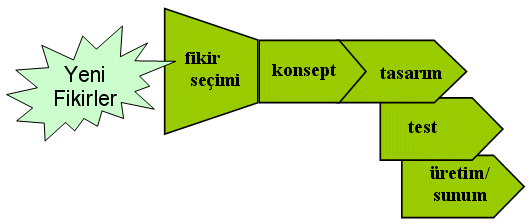 Yeni ürün geliştirme süreci bir huni gibi görülebilir: Sayısız yeni fikirle başlayan süreçte, bu fikirlerin hedefler ve eldeki kaynaklar doğrultusunda elimine edilmesiyle odak noktası giderek daraltılır ve sonuçta pazara sunulan bir yeni ürün (veya servis) ortaya çıkar.
