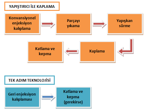 Daha az üretim aşaması, daha yüksek ve sürdürülebilir kaliteye ulaşmanın kilit noktasıdır. Daha yüksek oranda işlem entegrasyonu, sırayla akış sürecini kolaylaştıran ve daha az yer kaplayan üretim aşamalarını ortaya çıkartır. Şematik olarak Şekil 3.’de gösterildiği gibi, konvansiyonel laminasyon sürecinde, parçanın enjeksiyon kalıplaması, yıkama, yapışkanın uygulanması, laminasyon ve daha sonra katlama ve kenar kırpma gibi üretim aşamalarından oluşur. Tek sefer işleminde, kumaşın geri enjeksiyon işlemi tek üretim basamağında uygulanır. Örneğin, film veya kumaş ya kalıplama çevrimine başlamadan önce istenen ölçülerde kesilir, ya kalıp içinde istenen ebatlarda kesilir, ya da çevrim tamamlandıktan sonra kalan kenarlar yine robot vasıtasıyla kırpılır. Bazı durumlarda, kalıpta uygulanmayan katlamayı daha sonra uygulamak mümkündür. Daha az sayıdaki zorunlu üretim adımları kalite seviyesini arttırır ve hasar ihtimalini azaltır.