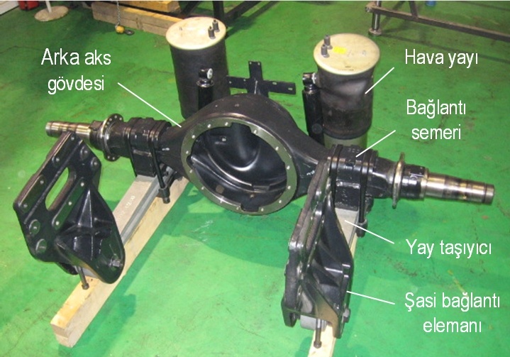 Sabit akslar, yük taşıma kapasiteleri nedeniyle ağır vasıta uygulamalarında genellikle tercih edilen konstrüksiyonlardır [1]. Yüksek kapasiteli bir ticari araçta kullanılan sabit arka aksın yapısı Şekil 1'de görülmektedir. Yol düzgünsüzlükleri nedeniyle ortaya çıkan dinamik kuvvetler, bu sistemin asıl taşıyıcı elemanı olan arka aks gövdesini çalışma ömrü boyunca darbeli olarak zorlar. Bu nedenle gövde tasarımının yalnızca statik yükleme etkileri üzerinden yapılması, sistemin öngörülen işletim ömründen daha önce hasara uğramasıyla sonuçlanabilir. Bunu önlemek için tasarım aşamasında, yorulma ömrü hesaplamalarının da göz önüne alınması gerekir.