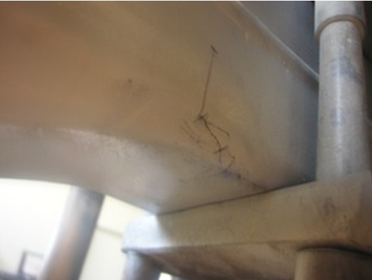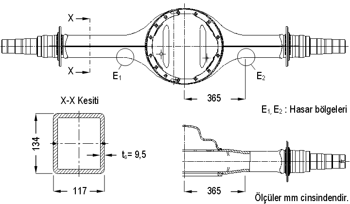 Şekil 3'te geometrik yapısı görülen asimetrik tipteki bir aks gövdesinin düşey yorulma testi sırasında bazı numunelerin, öngörülen bu sınıra ulaşmadan hasara uğradığı görülmüştür. Testlerde yorulma çatlağının ortaya çıktığı minimum yük tekrar sayısı yaklaşık 3,7.105 olarak belirlenmiştir. Hasarın genellikle, numunelerin gövde kolu - diferansiyel yatağı geçiş bölgelerinde (E1, E2) ortaya çıktığı gözlenmiştir. Test sırasında oluşan hasara ait örnek Şekil 4'te verilmektedir.