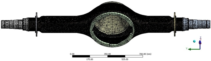 Analizlerde kullanılmak üzere CATIA® V5R15 paket yazılımı ile hazırlanmış üç boyutlu katı model Şekil 5'te görülmektedir. Gövde temel olarak, kaynakla birleştirilmiş ince cidarlı iki özdeş kabuktan oluşmaktadır. Yeterli rijitliğin sağlanabilmesi için diferansiyel kovanı bağlantı yüzeyine çember, sızdırmazlık için arka yüzeye kapak kaynak edilmektedir.