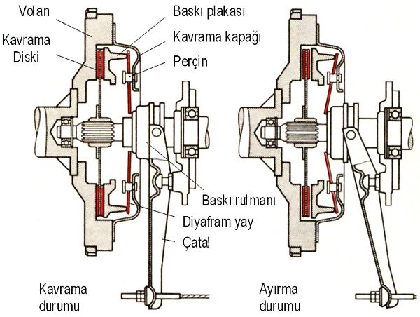 Diskli kuru kavramalarda temel olarak balatalı bir disk, baskı plakasıyla birlikte ve yay kuvveti etkisi ile volana bastırılarak, motordan alınan momentin vites kutusuna aktarımı sağlanmaktadır. Motor ile vites kutusu arasındaki bağlantının çözülmesi için sürücü mahallinde bulunan kavrama kumanda pedalına basılmak suretiyle yay kuvveti yenilmekte ve baskı plakası serbest bırakılmaktadır (Şekil 2). Böylelikle balatalı diskin volan ile teması kesilmektedir. Sistemde baskı yayı görevini üstlenen diyafram yay iki taraflı bir manivela kolunu meydana getirmektedir. Manivela hareketinin gerçekleştirilmesi için yay, mesnet görevi gören kavrama kapağına perçinlerle ve öngerilmeli olarak bağlanmaktadır. Güç iletimi sırasında, yayın dış kenarı (etek) baskı plakasına basmaktadır. Kavramanın ayrılması için baskı rulmanı pedal kuvveti etkisiyle, diyafram yayın iç kısmındaki dilleri eksenel yönde ittirir. Böylece yay, perçinler üzerinde elastik olarak şekil değiştirerek baskı plakası ile kavrama diskini ayrılır ve kuvvet iletimi kesilmiş olur.