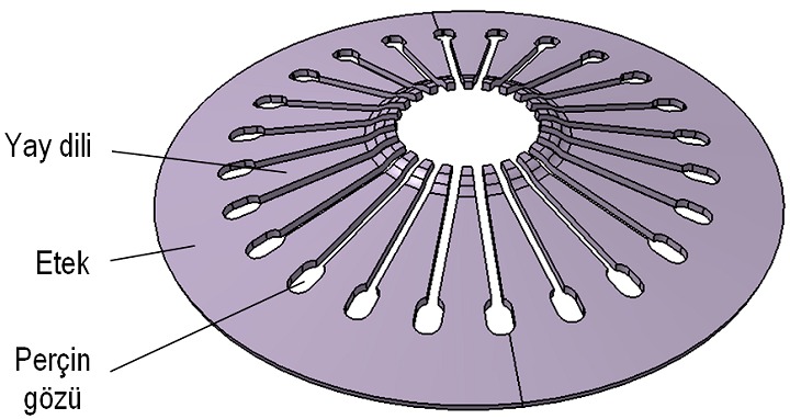 İşletim sırasında kapakta ortaya çıkacak elastik şekil değişimi miktarının belirlenebilmesi için, parçaya etkiyen kuvvetlerin bilinmesi gerekmektedir. Kavrama konstrüksiyonunda diyafram yaylar kavrama kapağına, perçinler ve mesnet halkası ile Şekil 3'te görülen biçimde bağlanmaktadırlar. Çalışmanın ilk aşamasında, kavramanın ayrılması sırasında yayda meydana gelen elastik şekil değişimi nedeniyle, bağlantı perçinlerinden kapağa iletilen kuvvetler belirlenmiştir.