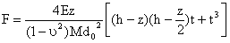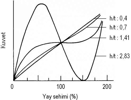 Burada E; yay malzemesinin elastisite modülü, v; Poisson oranı, t; kesit kalınlığı, h; yay yüksekliği, d0 ve d1 sırasıyla; disk yayın dış ve iç çapıdır. M, d0/ d1 oranına bağlı sabit bir değer olup, literatürde verilen ilgili diyagramlardan elde edilebilmektedir [6; 7]. (1) Bağıntısından elde edilen yay karakteristiğinin çeşitli yükseklik/kalınlık (h/t) oranlarına bağlı değişimi Şekil 6'da görülmektedir. Buna göre disk yayın rijitliği yay sehiminin fonksiyonu olup, parça üzerine etkiyen kuvvetin büyüklüğüne bağlı olarak değişmektedir [8; 9]. Taşıt kavramalarında kullanılan diyafram yaylar da yapıları gereği, disk yay karakteristiğine çok yakın bir özellik gösterir. Üretim sırasında yay, kavramaya % 100 sehimle yani düzleştirilmiş şekilde, öngerilmeli olarak monte edilmektedir. Bu uygulamayla, yayın h ve t ölçülerine bağlı olarak kuvvet karakteristiğinde yataya yakın degresif bir bölge elde edilebilmektedir. Böylece, yaklaşık sabit bir kuvvet ihtiyacı ile kavramanın çalışmasına olanak sağlanmaktadır [1; 2].