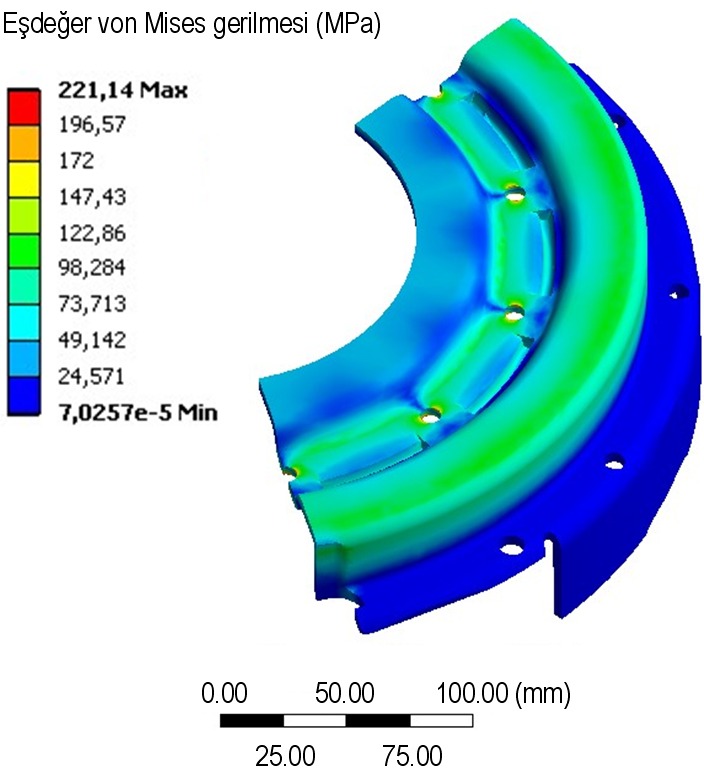 Parça genelinde von Mises gerilmesi = 0-195 MPa aralığında değişmektedir. İstisna olarak, perçin yuvası içindeki çok sınırlı bir bölgede, maks= 221,14 MPa değerine kadar çıkabildiği belirlenmiştir. Bu, işlem görmemiş sac malzemenin akma sınırının yaklaşık %85'ine denk düşmektedir. Kavrama yayının gerçek çalışma bölgesinde analiz tekrarlandığında, Şekil 13'e göre z= 6 mm sehim ve F= 19050 N yay kuvveti için maks= 206,5 MPa; z= 8 mm ve F= 18383 N için maks= 199,28 MPa değerleri elde edilmiştir. Perçin yuvaları ağzında oluşturulacak yuvarlatmalar yardımıyla maks değerinin %10'a kadar azaltılabildiği de tespit edilmiştir. Tüm bunlara ek olarak imalat sırasında, soğuk şekillendirme nedeniyle malzemenin akma sınırında belirli ölçüde bir artış söz konusu olacağından parçanın, öngörülen yük altında elastik bölgede ve emniyetli olarak çalışacağı söylenebilir.